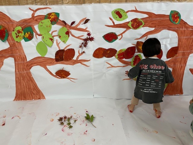 次は、床に落ち葉を描いていきます。初めてのローラー、楽しいね!