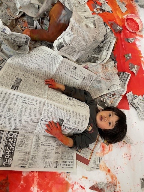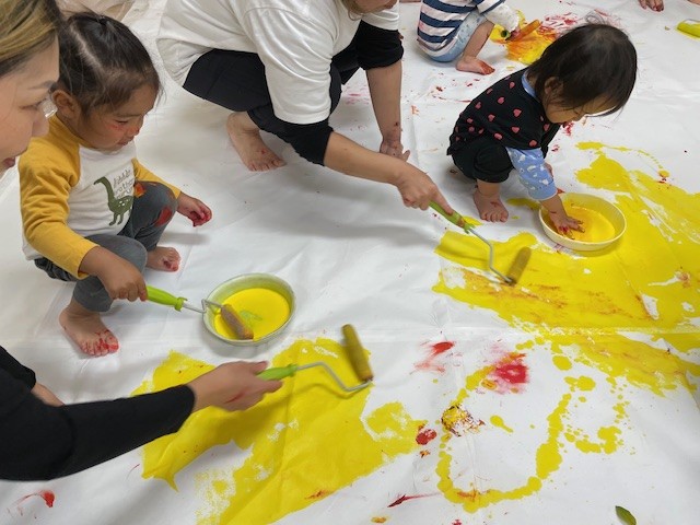 黄色に橙、赤・・・ぐちゃぐちゃになってきました・・・そして、手で足でぐちゃぐちゃの感触を楽しみます!