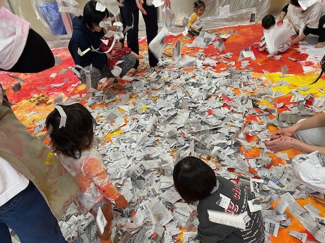 新聞紙の落ち葉が大量にふってきて・・・みんな大興奮!