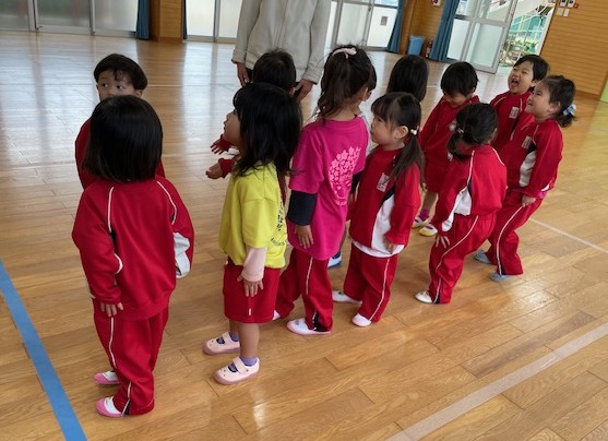 1番最初にお遊戯室入りしたのは、2歳児クラス・年少々クラスのお友達です♪
